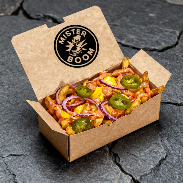 Хрупкави пържени картофи с разтопен чедър, пикантен сос, червен лук и люти халапеньо. Вкус, който идва направо от дълбините на вкусовата галактика!